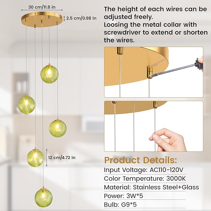 - Light Source: It comes with 5 G9 LED bulbs that emit 3000K warm light. With a voltage range of 110 - 240V, it is suitable for use in a variety of electrical environments.This 5-light cluster pendant lights stairwell lighting itself is not dimmable, but it can be dimmable when work with dimmable bulb and dimmable switch.