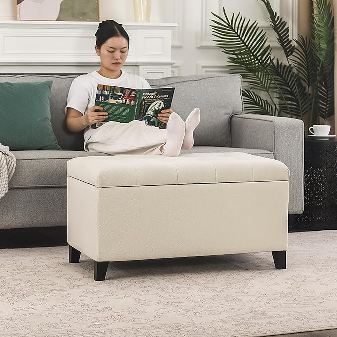 - [High Quality Materials]: This storage ottoman is crafted from a premium cotton and linen fabric and a tastefully tufted design, this storage bench blends comfort with style effortlessly. Our ottoman with storage has thickly padded and foam cushion provides you with complete comfort and soft support when used as extra seating.