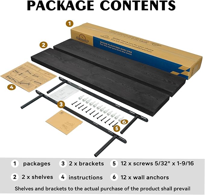 - EASY TO INSTALL: These 24inch floating shelves come with stainless steel galvanized invisible brackets, toggle bolts for drywall, and simple instructions to help you install them. These wall shelves are easy to assemble, requiring only two boards and the necessary screws and hardware. We also provide detailed instructions for quick and easy assembly