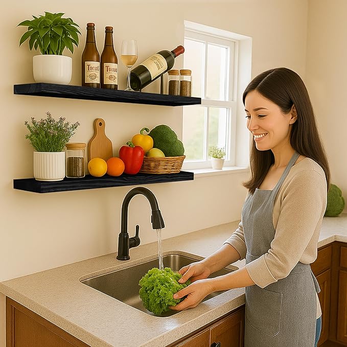 - MULTIFUNCTIONAL DECORATIVE SHELF: Modern minimalist style floating wall shelf is suitable for a variety of scenarios. Use it in the kitchen to store spices, bottles, cups; install it in the bathroom to store shampoo, conditioner, body wash and more. Also perfect for bedroom, living room, office, etc., beautiful and space-saving