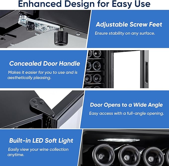 - Efficient Compressor Cooling: The ORYMUSE 24 Bottle Wine Fridge uses advanced compressor cooling for rapid, efficient temperature control. With a range of 41°F to 64°F, it maintains the perfect conditions for reds, whites, and sparkling wines. Unlike thermoelectric coolers, the compressor system offers faster cooling and better temperature stability, ensuring your wine is stored at the ideal temperature for flavor and aroma preservation.
