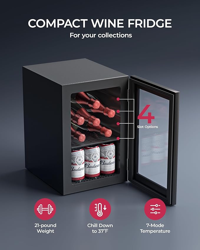 - 【Sleek & Space-Smart Design】Elevate your space with this compact yet capacious wine fridge. The mini fridge featuring a mirrored glass door and slim profile (14.9"D x 11"W x 16.7"H), while holding up 21 cans of 330ml drinks—perfect for entertaining or personal use.