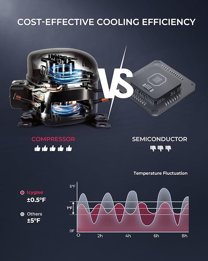 - 【Rapid & Rapid Cooling Tech】Equipped with R600 compressor and 7-stage temperature control (37°F–57°F), Icyglee mini fridge for bedroom maintains optimal conditions for beer, soda, or premium wines. This small refrigerator features cutting-edge compressor cooling, delivering consistent temperature regulation to maintain drinks at their ideal chill—regardless of external fluctuations