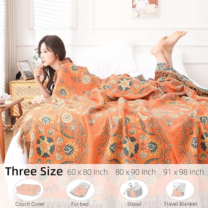 Boho Throw Blanket for Bed - 100% Pure Cotton Ultra Soft Rustic Quilt - Farmhouse Decor Bed Blankets, All Season Rustic Throw for Sofa Couch Chair(60"×80", Boho)