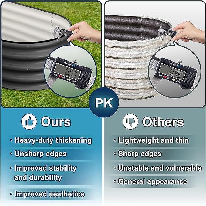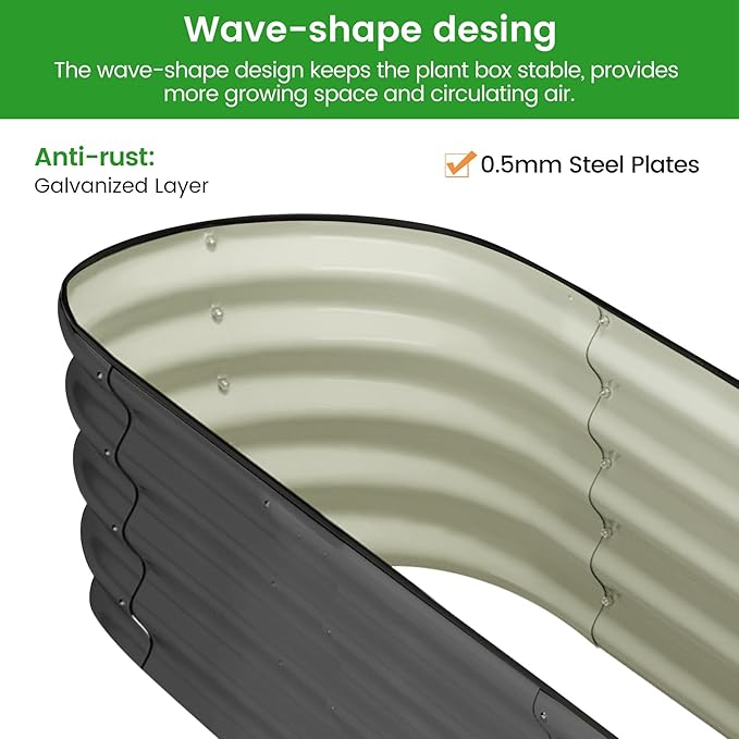 - 🌳 Unmatched Stability: Crafted with 0.5mm thick overlapping galvanized panels, reaching up to 1.8mm at the seams, our raised garden bed provides excellent strength and stability. The integrated screw fastening edge and unique oval form ensure it remains solid and secure, even when fully planted.