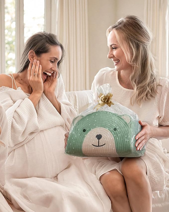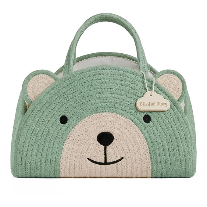 Blissful Diary Baby Diaper Caddy Organizer, Cotton Rope Diaper Caddy Basket, Large Storage Basket, Gift for Baby Shower, Newborn Essentials, Bear Roman Green