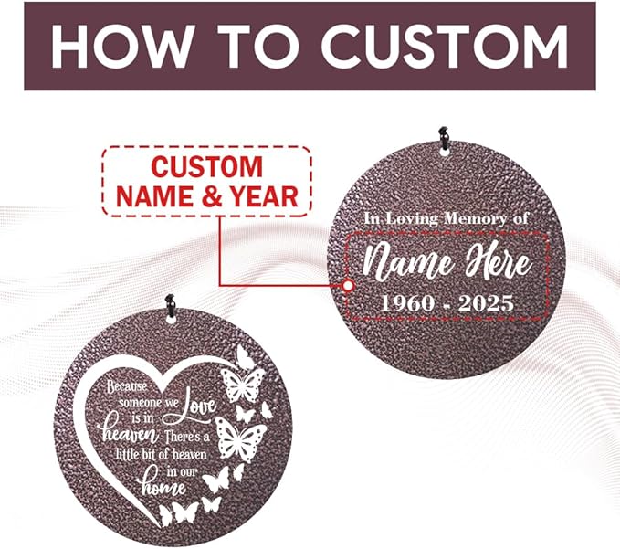 - đPersonalized Wind Chimes: With heart butterfly and some words like "Because someone we love is in heaven, there's a little bit of heaven in our home" on the one side of catcher, another side of catcher is customized the name&date you want. It provides peace and comfort to a grieving friend who has lost a loved ones such as parents and so on.