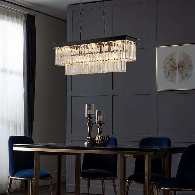 - BLACK CRYSTAL CHANDELIERS:This chandeliers for dining room using K9 crystal with 2-tier design and black rectangular lamp frame.When you turn on the light,the lighting will reflect through the crystal,adding a romantic and unique atmosphere to your room
