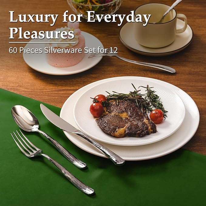 Aisoso 60-Piece High-End Silverware Set with Stone Patterned Handle Mirror Finished Stainless Steel Serving Utensils for 12, Durability and Dishwasher Safe for Home, Restaurant, Weddings