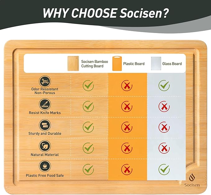 - Knife-Safe Surface for Edge Preservation: Our bamboo cutting board features a durable and thick surface. Meticulously polished to be ultra-smooth and flat, it has no burrs, cracks, or splinters. The bamboo cutting board is gentle on knives, reducing dulling and blade damage. Whether using a serrated knife for bread or a chef's knife for vegetables, the wood cutting board prevents blades from dulling quickly, saving you time on sharpening and allowing more time for enjoying your cooking.