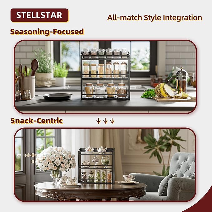 - FIX THE SPICE MESS: Tired of spice clutter? Our 3-tier bamboo rack solves it. Sized 15.83"W x 4.96"D x 15.75"H (5.9" per tier), it saves counter space while triples storage. With 4.96" depth, it fits spices to cans. Each shelf holds 8+ jars; the top tier is for tall bottles. Front guardrails keep jars safe. Get an organized kitchen with this handy rack