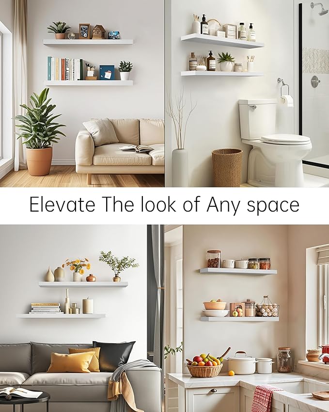 BAYKA Floating Shelves for Wall, 36 inches Long Wall Mounted Rustic Wood Shelves for Bathroom, Bedroom, Living Room, Kitchen, Office, Hanging Shelf for Books/Storage/Decor(White,Set of 2)
