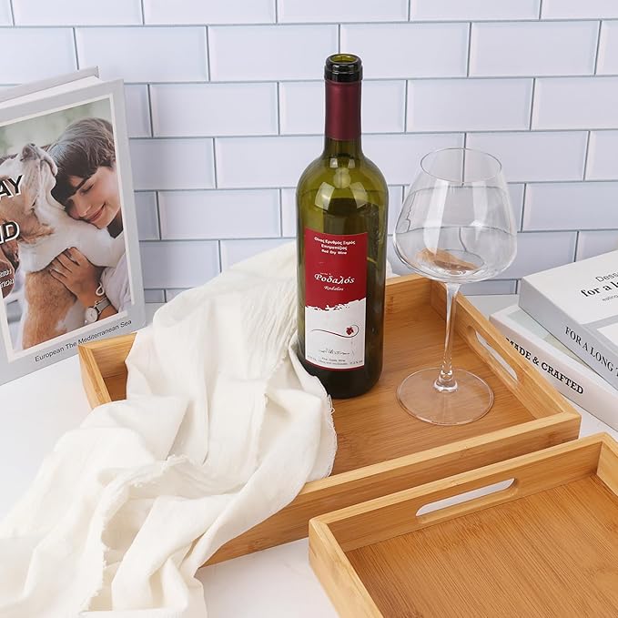- 【Set of 3 Bamboo Trays】This package includes four large bamboo serving trays, adding a touch of natural elegance to your dining and entertaining needs. They are ideal for daily use or special occasions, and can also be a thoughtful housewarming gift.