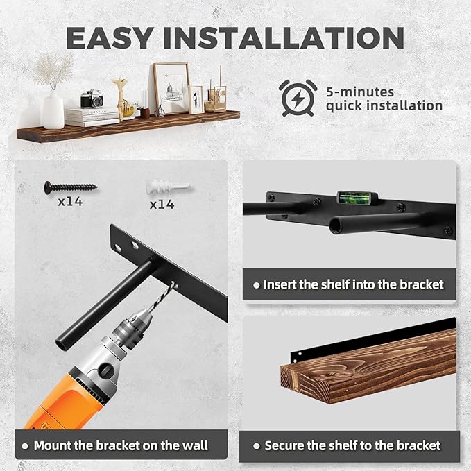 - Stable Floating Brackets: The shelves include hidden steel brackets for secure and wobble-free support. This clean floating look seamlessly blends into any room, whether it’s the living room, kitchen, or office