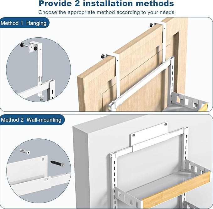 - 【Adjustable and Detachable】You can adjust the height of each layer of the door kitchen rack to fit your cans, spices or other items of different sizes, which works well for your various storage needs.The basket can be easily removed and placed where you want
