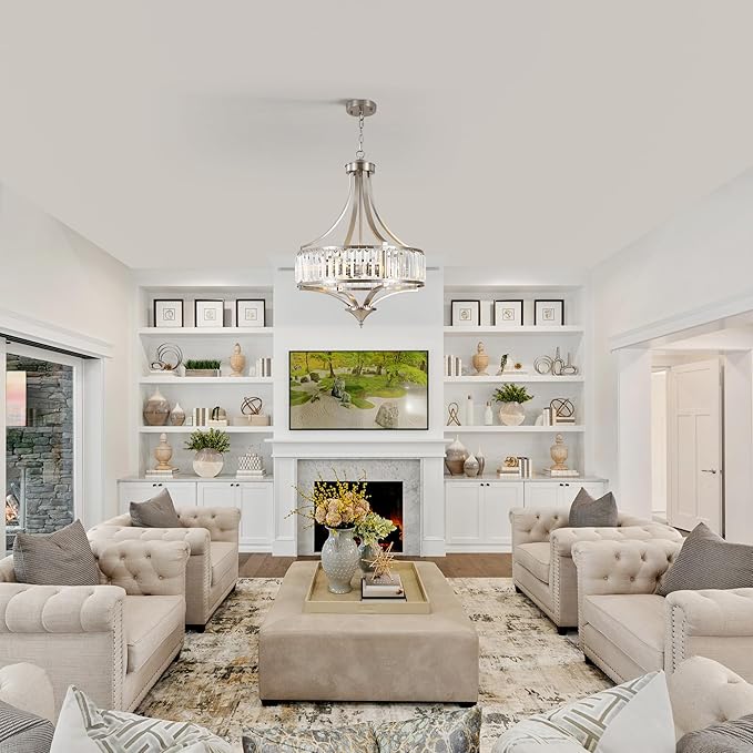 - Modern Farmhouse Style: Brushed nickel crystal chandelier is crafted by skillful artisans. The crystal strips in the main part are skillfully arranged to form an elegant circular structure. Whether it is in the common living room where you spend time with your loved ones, the dining room where you enjoy cooked meals, the chic chandelier fits right in to light up every moment spent inside the comfort of your home.