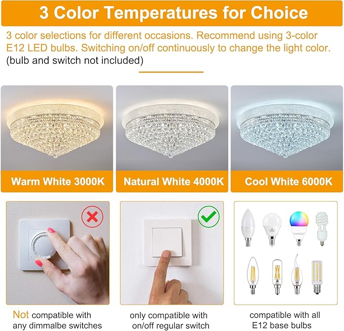 - 【Light Up Your Room】18 x E12 Bulbs (Not included) will be worked well with this empire chandelier. Recommend using 3-color LED bulbs and compatible dimmer switch (Not included). You could choose which color temperature (warm white-3000K / neutral white-4500K / daylight white-6000K) would be fit for yours rooms.