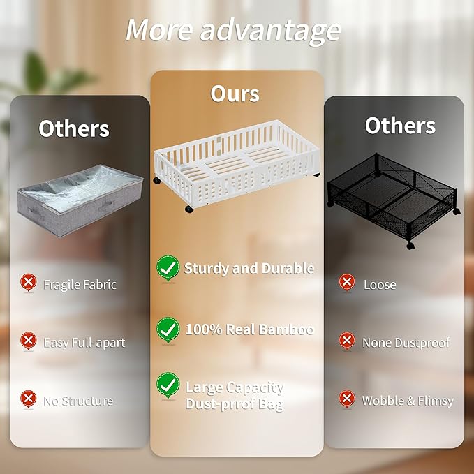 - Easy Assembly & Fit Most Beds: Simple assembly required, and the compact design fits under most standard beds. Transform the wasted space under your bed into a functional storage area with these bamboo under bed storage units.