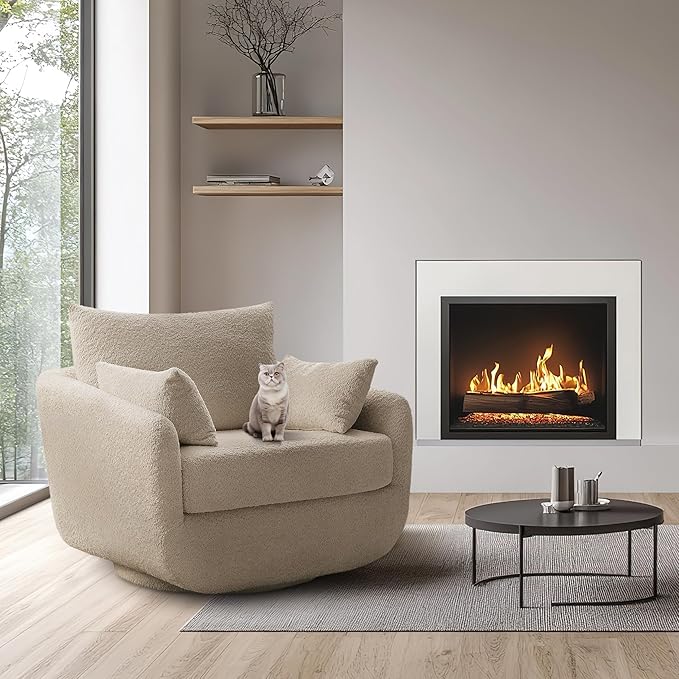 360° Swivel Accent Armchair, 39.3" Oversized, Sherpa Boucle Fabric Sofa Chair with Removable Back & Arm Pillows, Swivel Chair with Cozy Soft Padded, No Assembly Required (1, Camel)