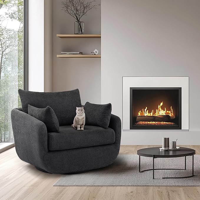 - Durable Construction & Floor-Friendly Design---Built to last with a 360° solid wood swivel base (supports 330 lbs) and reinforced steel frame,No wobbling, squeaking, or sudden drops,just silent, stable rotation perfect for conversations,With its swivel base, the chair can rotate fully,maximizing space utilization in smaller rooms.The wood he base is wrapped with black anti-dirty gaske also protects hardwood floors from scratches.