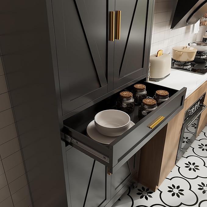 71 "Farmhouse Metal Filing Cabinet with a Drawer and 4 Adjustable Shelves, with 4 Large barn Door White Kitchen Cabinets, Metal Food Cabinets for Home, Kitchen, Dining/Living Room (Black)