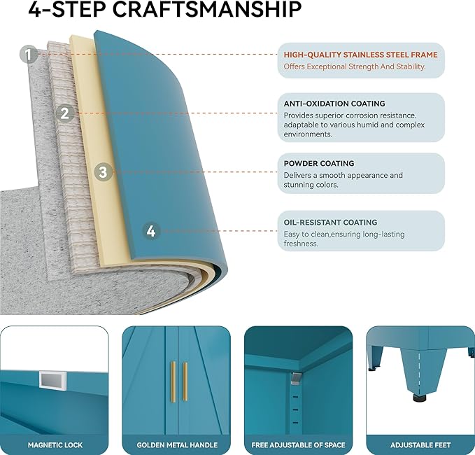 71 "Farmhouse Metal Filing Cabinet with a Drawer and 4 Adjustable Shelves, with 4 Large barn Door White Kitchen Cabinets, Metal Food Cabinets for Home, Kitchen, Dining/Living Room (Peacock Blue)