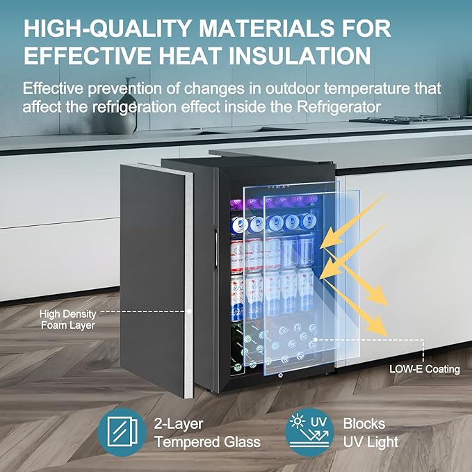 - ADVANCED INSULATION & SUN PROTECTION MATERIALS: This mini fridge features a double-layer tempered glass door with Low-E coating to block sunlight and maintain a stable temperature. The stainless steel body, high-density foam insulation, and tight door seal ensure energy efficiency and consistent cooling.