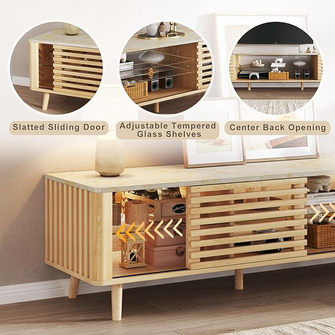 - Mid-century TV Stand Design: Modern TV stand with slatted sliding door design and faux marble top that effortlessly complements any room. The slatted doors without hardware enhance TV console's chic, minimalist aesthetic. Elegantly replicates natural marble patterns, exuding luxury while serving as the perfect modern entertainment center for your living room.