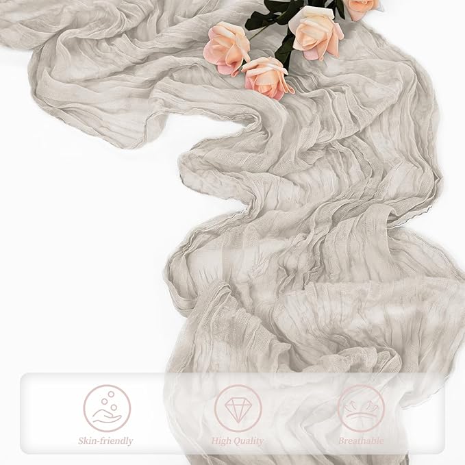 - Soft Table Runner Materials: This cheesecloth table runner is made of high-quality gauze, with a very soft touch and long-lasting durability. The exquisite edge stitching makes it look even more beautiful. It hangs naturally, and the pure plant dye does not fade, has no odor, and can be reused. It is romantic for every occasion of your life.