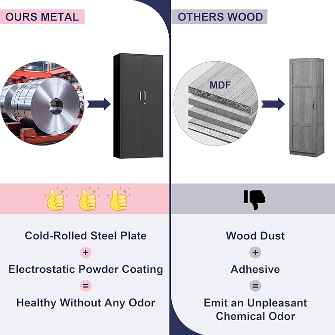 - Sturdy Metal Garage Storage Cabinet: Built with robust steel construction, this garage storage cabinet is designed for long-lasting use. The powder coated finish resists rust and maintains a sleek matte look. Perfect for garages, kitchens, or offices, it keeps tools, pantry items, or office supplies neatly organized and protected