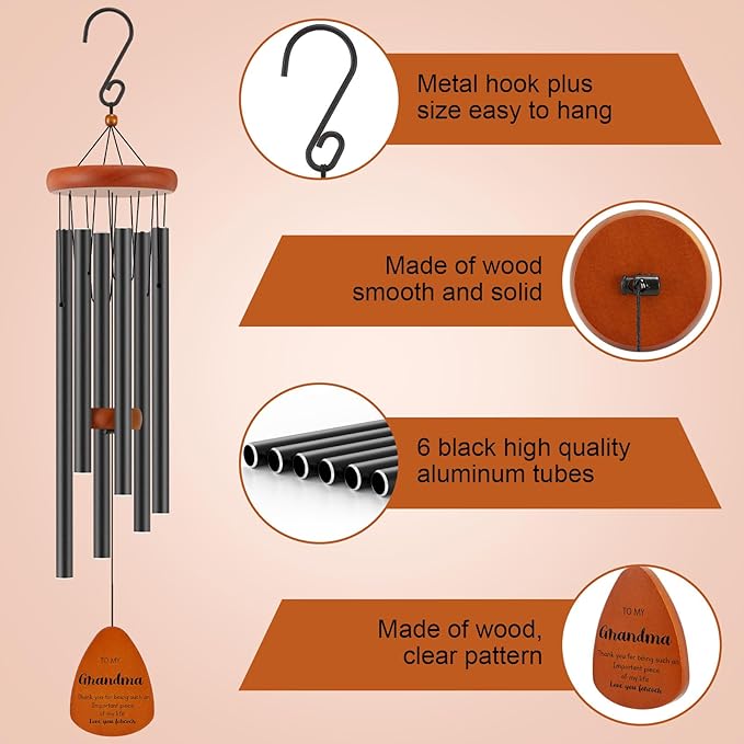 - Soothing Sounds for Relaxation: With its precise design and six thick-walled aluminum tubes, this wind chime gift produces soothing melodies, creating a serene atmosphere that promotes relaxation and tranquility. It's a perfect way to express your love and strengthen your bond with your grandma.