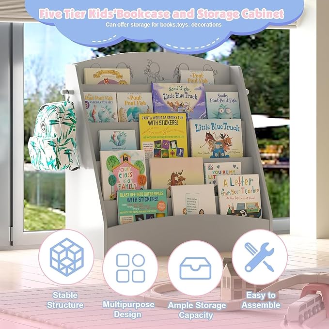 - 5-Tier Display and Storage Shelves: This 5-layer kids bookcase provides ample storage space for your children's storybooks, picture books, magazines, cardboard books, comics, and more. With reasonable depth, it is an ideal option for kids to categorize and organize their books and keep their room neat and clean.