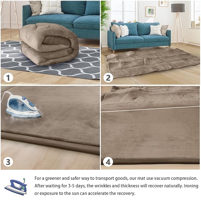 - đHOW TO CARE FOR YOUR MAT:When you open the package,it may be wrinkled,very flat and inelastic.Don't fret - this is normal! As long as it is left for 3-5 days, the mat will naturally regain its thickness and elasticity. we recommend steaming or ironing it to speed up recovery. After you have completed the steaming/ironing, your thick floor padded mat should rebound and be ready to use!