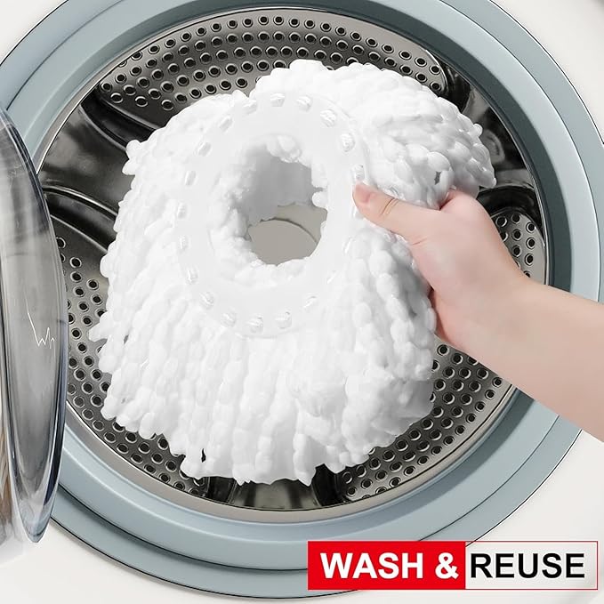 - MACHINE WASHABLE & DEEP CLEANING MICROFIBER :Our Mop Head is machine-washable and reusable! We recommend replacing the mop head refill every 3 months for optimal floor cleaning results,Spin Mop uses microfiber to effectively capture dirt and grime with just water, eliminating the need for harsh chemicals. Safe for all hard flooring, including finished hardwood, wood, laminate, tile, etc
