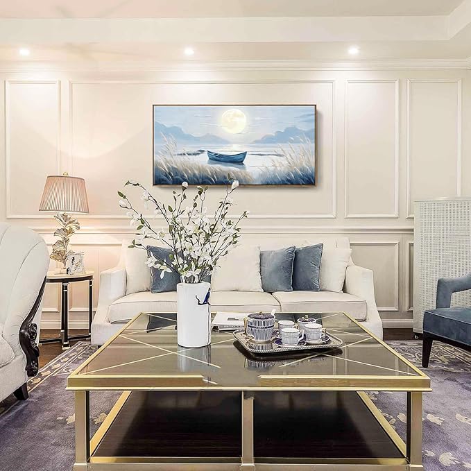 amatop Large Framed Wall Art Bedroom Living Room Decor Blue Boat Moonlight Coastal Seascape Picture Landscape Decorative Canvas Print Tranquil Night Ocean Lake Scene Artwork Nautical Wall Decor 48x24