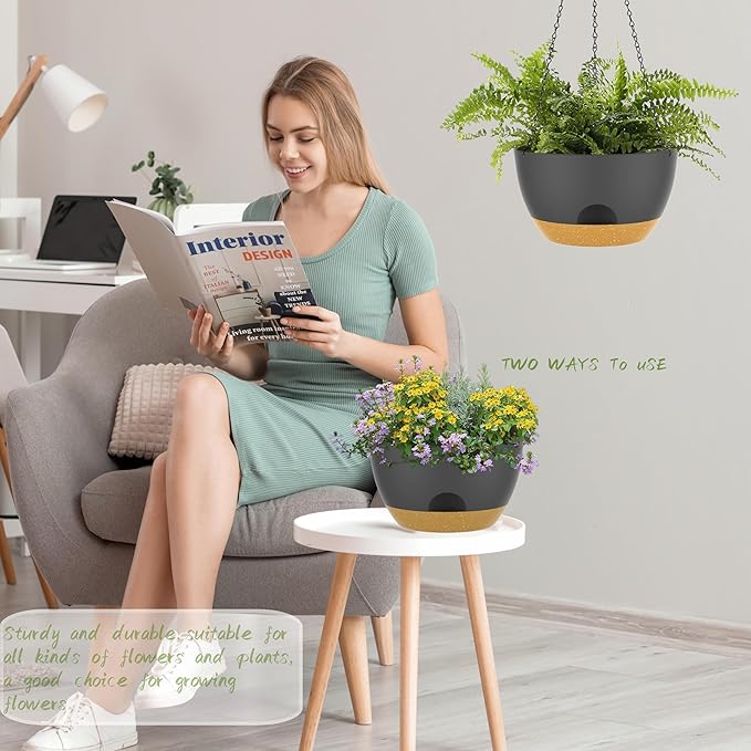 - 【Self-Watering Hanging Flower Pots with Removable Saucer】the appearance and structural design of the Hanging Pot prevents overwatering and acts as a water reservoir to promote Plant growth. It is suitable for a variety of Hanging Pot Plants, such as ivy, Herbs, Ferns, Philodendrons, Succulents, Flowers or other Plants