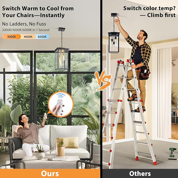 - Remote-Controlled, Dimmable Outdoor Pendant Light for Patio: No more manual tweaks on the light body—AIBISOD black gold outdoor pendant light for patio comes with a remote, letting you adjust color temp and brightness easily from the ground. Stepless dimming (0-100%) and one-touch half-bright mode save 50% energy, fitting gatherings or high patio/porch spots perfectly