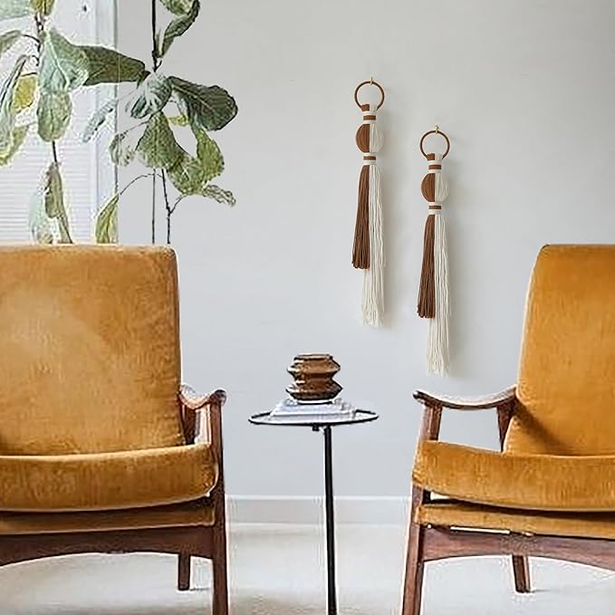 2Pcs Macrame Wall Hanging Boho Home Decor Fiber Art with Sphere Knots Tassels Handmade Yarn Art for Bedroom Living Room Office Entryway