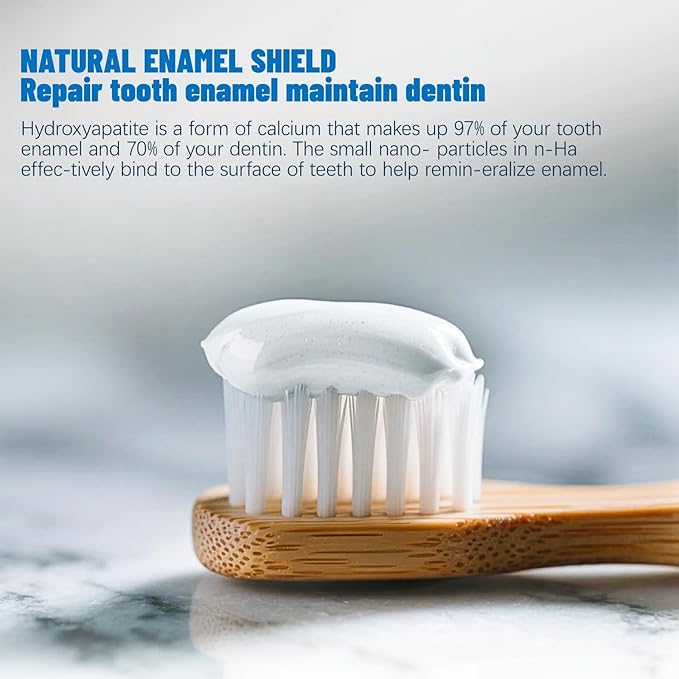 - đĄïžăNatural Enamel ShieldăHydroxyapatite is what your teeth truly want. It is a naturally occurring mineral that closely mimics the composition of human teeth and bones. This similarity helps restores and strengthens enamel, reducing the risk of cavities and erosion, promoting long-term oral health. Rebuilds your smile's armor.