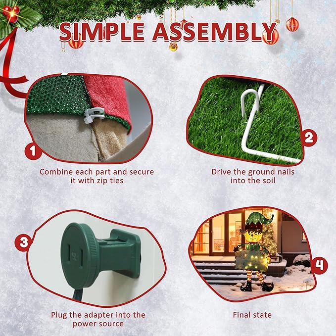 - Easy to Assembly: This Elf with envelope light uses Male-Female Connector. It only takes 3 steps to assembly. Step 1: Take out all the items from the package. Step 2: Assemble it according to the instructions. Step 3: Plug in the socket to light it up. If you are going to use this Elf for outdoor, don’t forget the ground stakes included that will make it well fixed on the ground